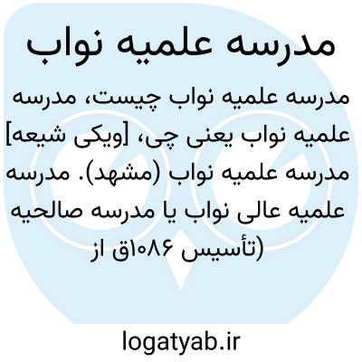 [ویکی شیعه] مدرسه علمیه نواب (مشهد). مدرسه علمیه عالی نواب یا مدرسه صالحیه (تأسیس ۱۰۸۶ق از مدارس علمیه مشهور مشهد است که در ضلع شمالی بالا خیابان (نادری سابق و شیرازی فعلی) و در نزدیکی حرم امام رضا قرار دارد. تاریخ تأسیس مدرسه به سال ۱۰۸۶ق بازمی گردد و دارای معماری خاص با حجراتی در دو طبقه است. کتابخانه این مدرسه به جهت وجود نسخه های خطی از گذشته مورد توجه علاقمندان بوده است.