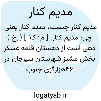 مدیم کنار. [ م ُ ک َ ] ( اِخ ) دهی است از دهستان قلعه عسکر بخش مشیز شهرستان سیرجان در 46هزارگزی جنوب شرقی مشیز بر سر راه مادون به جعفرآباد، در منطقه کوهستانی سردسیری واقع است و 285 تن سکنه دارد. آبش از رودخانه تأمین می شود. محصولش غلات و حبوبات و شغل مردمش زراعت و مالداری است. ( از فرهنگ جغرافیایی ایران ج 8 ).