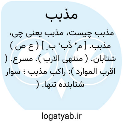 مذبب. [ م ُ ذَب ْ ب ِ ] ( ع ص ) شتابان. ( منتهی الارب ). مسرع. ( اقرب الموارد ): راکب مذبب؛ سوار شتابنده تنها. ( منتهی الارب ). راکب منفرد شتاب. ( از اقرب الموارد ). || ظماء مذبب؛ تشنگی دراز که جهت آن از دور به سوی آب شتافته شود. ( منتهی الارب ). تشنگی دراز که برای رفع آن راهی دور بایست پیمودن. ( یادداشت مؤلف ). با عجله و شتاب. ( از متن اللغة ) ( از اقرب الموارد ).