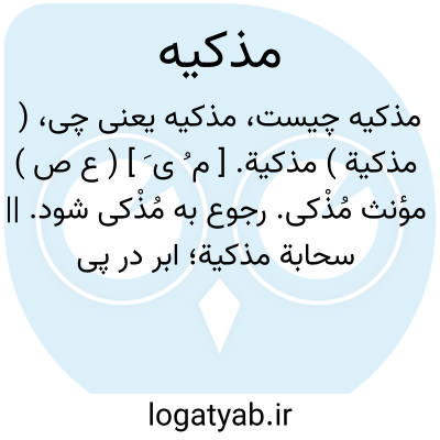 لغت نامه دهخدا ( مذکیة ) مذکیة. [ م ُ ی َ ] ( ع ص ) مؤنث مُذْکی. رجوع به مُذْکی شود. || سحابة مذکیة؛ ابر در پی هم بارنده. ( از متن اللغة ). ابر باربار بارنده. ( منتهی الارب ) ( ناظم الاطباء ) ( آنندراج ).مذکیة. [ م ُ ذَک ْ کی ی َ ] ( ع ص ) مؤنث مُذَکّی. رجوع به مُذَکّی شود.