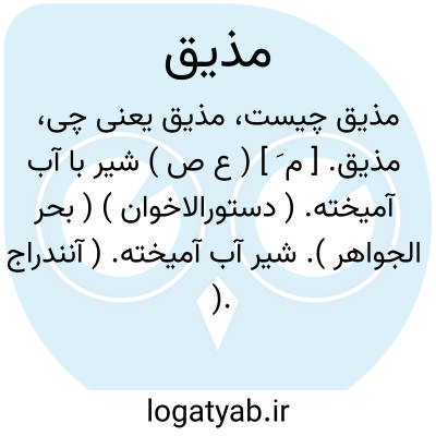 مذیق. [ م َ ] ( ع ص ) شیر با آب آمیخته. ( دستورالاخوان ) ( بحر الجواهر ). شیر آب آمیخته. ( آنندراج ). مذوق. ( بحر الجواهر ).