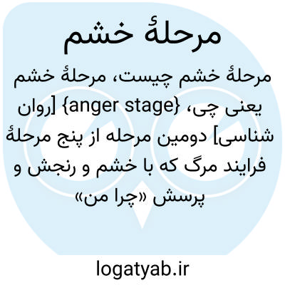 فرهنگستان زبان و ادب {anger stage} [روان شناسی] دومین مرحله از پنج مرحلۀ فرایند مرگ که با خشم و رنجش و پرسش «چرا من» همراه است