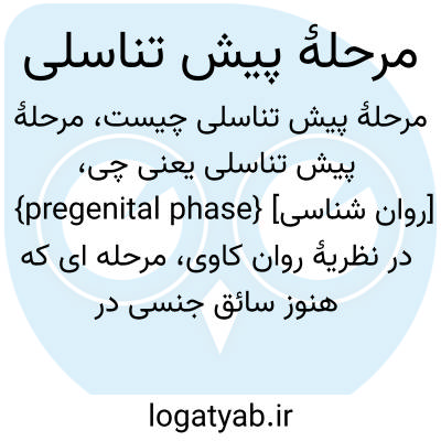 فرهنگستان زبان و ادب {pregenital phase} [روان شناسی] در نظریۀ روان کاوی، مرحله ای که هنوز سائق جنسی در نواحی تناسلی متمرکز نشده است