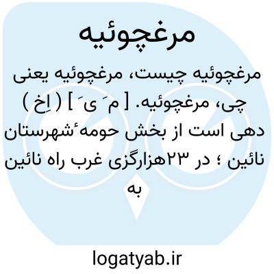 مرغچوئیه. [ م َ ی َ ] ( اِخ ) دهی است از بخش حومه ٔشهرستان نائین؛ در 23هزارگزی غرب راه نائین به کوهپایه، با 145 تن سکنه. آبش از قنات. محصولش غلات. شغل مردمش زراعت است. ( از فرهنگ جغرافیایی ایران ج 10 ).