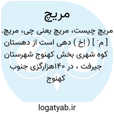 مریچ. [ م َ ] ( اِخ ) دهی است از دهستان کوه شهری بخش کهنوج شهرستان جیرفت، در 140هزارگزی جنوب کهنوج سرراه مارز به منوجان، در منطقه کوهستانی گرمسیری واقع و دارای 100 تن سکنه است. آب آن از قنات و راه آن مالرو است. محصولش خرما و گندم و شغل مردمش زراعت است. ( از فرهنگ جغرافیایی ایران ج 8 ).