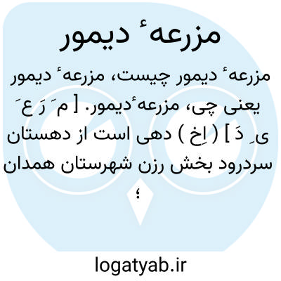مزرعه ٔدیمور. [ م َ رَ ع َ ی ِ دَ ] ( اِخ ) دهی است از دهستان سردرود بخش رزن شهرستان همدان؛ در 30هزارگزی غرب رزن کنار راه دمق به کبودرآهنگ در دامنه سردسیرواقع و دارای 270 تن سکنه است. آبش از رودخانه دمق، محصولش غلات، لبنیات و مختصر انگور، شغل مردمش زراعت و گله داری است. ( از فرهنگ جغرافیایی ایران ج 5 ).