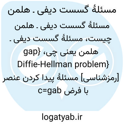 {gap Diffie-Hellman problem} [رمزشناسی] مسئلۀ پیدا کردن عنصر c=gab با فرض در اختیار داشتن سه تایی (gb, ga, g ) و نیز با فرض توانایی حل مسئلۀ تصمیم دیفی هلمن