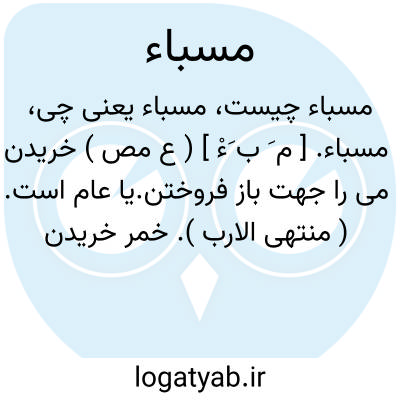 مسباء. [ م َ ب َءْ ] ( ع مص ) خریدن می را جهت باز فروختن.یا عام است. ( منتهی الارب ). خمر خریدن بهر خوردن. ( تاج المصادر بیهقی ). خریدن خمر برای خوردن آن، و اگر خریدن برای حمل کردن به شهر دیگری باشد فعل آن سَبا به صورت ناقص به کار رود و این فعل خاص خمر است. ( اقرب الموارد ). || تازیانه زدن. ( منتهی الارب ) ( اقرب الموارد ). || سوختن پوست را بوسیله آتش. ( منتهی الارب ) ( اقرب الموارد ). || برکندن و سلاخی کردن پوست را. ( اقرب الموارد ). || داغ کردن و تغییر وضع دادن آتش یا آفتاب یا حرکت یا تب پوست را یا انسان را. ( اقرب الموارد ). || مصافحه کردن. ( اقرب الموارد ). || جرأت کردن بر سوگند دروغ و اهمیت ندادن به آن. ( اقرب الموارد ). سب ء. سباء. رجوع به سب ء و سباء شود.