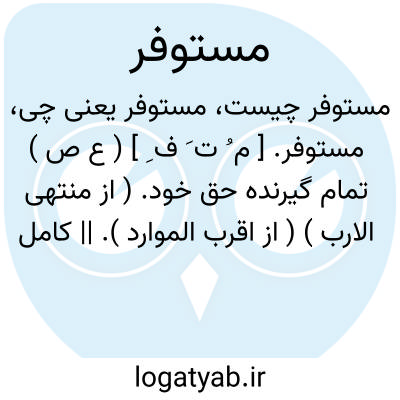 مستوفر. [ م ُ ت َ ف ِ ] ( ع ص ) تمام گیرنده حق خود. ( از منتهی الارب ) ( از اقرب الموارد ). || کامل کننده کاری را. ( از اقرب الموارد ). و رجوع به استیفار شود.