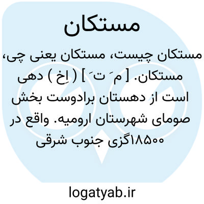 مستکان. [ م َ ت َ ] ( اِخ ) دهی است از دهستان حومه بخش صومای شهرستان ارومیه. واقع در 14500گزی شمال خاوری هشتیان و 4000گزی باختری راه ارابه رو ممکان به هشتیان. آب آن از چشمه و راه آن مالرو است. ( از فرهنگ جغرافیایی ایران ج 4 ).