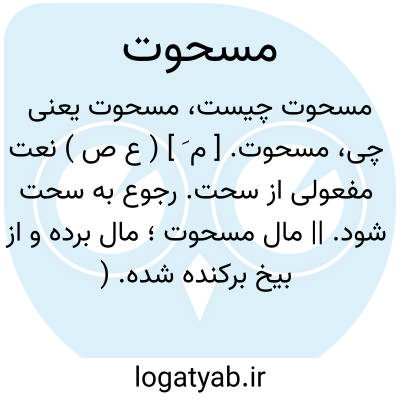 مسحوت. [ م َ ] ( ع ص ) نعت مفعولی از سحت. رجوع به سحت شود. || مال مسحوت؛ مال برده و از بیخ برکنده شده. ( منتهی الارب ) ( از اقرب الموارد ). مُسحَت. و رجوع به مُسحت شود. || مسحوت الجوف و المعدة؛ آنکه سیر نشود. ( از منتهی الارب ) ( از اقرب الموارد ). || آنکه به تخمه و سنگینی معده مبتلی گردد. از اضداد است. ( از منتهی الارب ) ( از اقرب الموارد ). || فراخ شکم. ( منتهی الارب ).