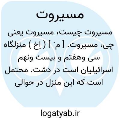 مسیروت. [ م َ ] ( اِخ ) منزلگاه سی وهفتم و بیست ونهم اسرائیلیان است در دشت. محتمل است که این منزل در حوالی «الطیبة» که برحسب احادیث بطرف مغرب کوه حور است واقع بوده، ولی اغلب آن را در وادی «موره » به مسافت 32 میل به جنوب غربی به جیرةالموت در دامنه کوه «جبل المدیره » که به گمان ایشان کوه حور صحیح و اصلی همان است دانسته اند. ( قاموس کتاب مقدس ).
