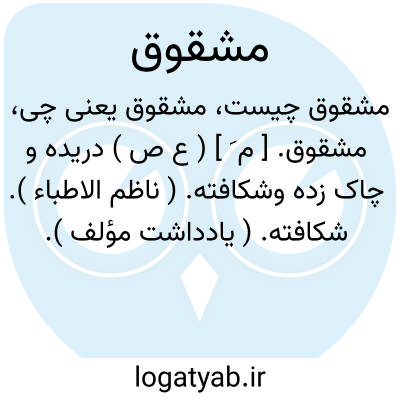 لغت نامه دهخدا مشقوق. [ م َ ] ( ع ص ) دریده و چاک زده وشکافته. ( ناظم الاطباء ). شکافته. ( یادداشت مؤلف ).
