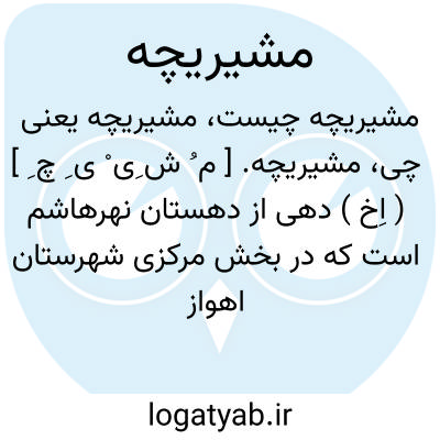 مشیریچه. [ م ُ ش ِی ْ ی ِ چ ِ ] ( اِخ ) دهی از دهستان نهرهاشم است که در بخش مرکزی شهرستان اهواز واقع است و 150 تن سکنه دارد. ( از فرهنگ جغرافیائی ایران ج 6 ).