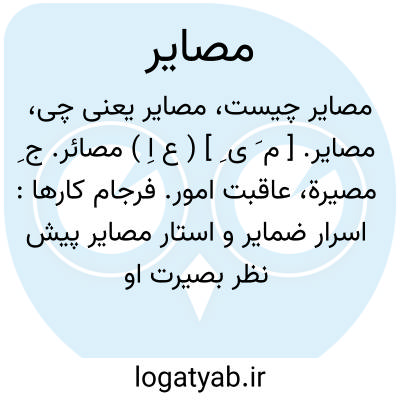 مصایر. [ م َ ی ِ ] ( ع اِ ) مصائر. ج ِ مصیرة، عاقبت امور. فرجام کارها: اسرار ضمایر و استار مصایر پیش نظر بصیرت او روشن و پیدا بودی. ( ترجمه تاریخ یمینی ص 279 ).