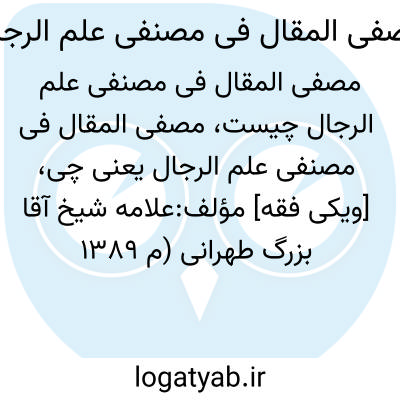 [ویکی شیعه] مصفی المقال فی مصنفی علم الرجال (کتاب). مَصْفَی الْمَقال فی مُصَنّفی عِلْمِ الرّجال کتابی به زبان عربی نوشته آقا بزرگ تهرانی (متوفای ۱۳۸۹ق). نویسنده در این اثر به معرفی مؤلفان کتب رجالی شیعه همراه با شرح کوتاهی از زندگی و آثار رجالی آنان می پردازد. مصفی المقال شامل شرح حال ۶۶۰ تن از عالمان رجال است که به ترتیب حروف الفبا در این کتاب گردآوری شده اند.