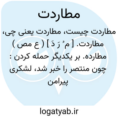 مطاردت. [ م ُ رَ دَ ] ( ع مص ) مطارده. بر یکدیگر حمله کردن: چون منتصر را خبر شد، لشکری پیرامن خیم او درآمده بودند. ساعتی به مطاردت و مجادلت ایشان بایستاد پس روی به هزیمت نهاد. ( ترجمه تاریخ یمینی چ 1 تهران ص 234 ). و رجوع به مطاردة و مطارده شود.