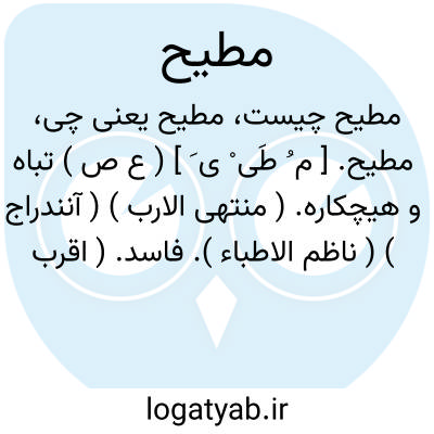 لغت نامه دهخدا مطیح. [ م ُ طَی ْ ی َ ] ( ع ص ) تباه و هیچکاره. ( منتهی الارب ) ( آنندراج ) ( ناظم الاطباء ). فاسد. ( اقرب الموارد ). و رجوع به ماده بعد شود.