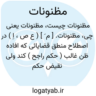 مظنونات. [ م َ ] ( ع ص، اِ ) در اصطلاح منطق قضایائی که افاده ظن غالب ( حکم راجح ) کند ولی نقیض حکم نیز ممکن باشد. چنانکه گویی فلان با دشمن من دوست است، و هر که با دشمن من دوست است پس دشمن من است، که ممکن است دوست دشمن تو باشد ولی دشمن تو نباشد. یا فلان شبها در بازارها میگردد و هر که شب در بازار میگردد دزد است، که نقیض این حکم نیز محتمل است.