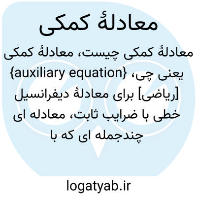 {auxiliary equation} [ریاضی] برای معادلۀ دیفرانسیل خطی با ضرایب ثابت، معادله ای چندجمله ای که با استفاده از جواب های آن می توان جواب های مستقل معادلۀ دیفرانسیل همگن متناظر را به دست آورد