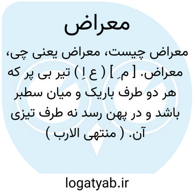 معراض. [ م ِ ] ( ع اِ ) تیر بی پر که هر دو طرف باریک و میان سطبر باشد و در پهن رسد نه طرف تیزی آن. ( منتهی الارب ) ( آنندراج ) ( از ناظم الاطباء ) ( از اقرب الموارد ). تیر بی پر که آن را به فارسی تیر گز گویند و آن تیری باشد که هر دو سر آن باریک و میانش سطبر، چون رها شود محرف شده از مجمع مرغان چند را شکار می کند. ( غیاث ). تیر بی پر که به پهنا حرکت می کند. تیرگز. ( یادداشت به خط مرحوم دهخدا ). || مضمون کلام. ( منتهی الارب ) ( آنندراج ). مضمون کلام و سیاق کلام. ( ناظم الاطباء ). فحوای کلام. ( از اقرب الموارد ).