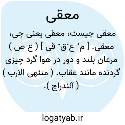 معقی. [ م ُ ع َق ْ قی ] ( ع ص ) مرغان بلند و دور در هوا گرد چیزی گردنده مانند عقاب. ( منتهی الارب ) ( آنندراج ). مرغی که از بلندی و دوری درهوا گرد چیزی گردد مانند عقاب. ( ناظم الاطباء ). گرد چیزی مرتفع گردنده مانند عقاب. ( از اقرب الموارد ).