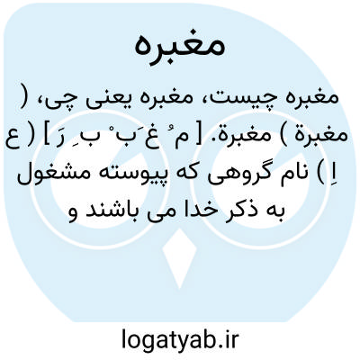 ( مغبرة ) مغبرة. [ م ُ غ َب ْ ب ِ رَ ] ( ع اِ ) نام گروهی که پیوسته مشغول به ذکر خدا می باشند و مکرر می کنند قرائت قرآن راو ترغیب می کنند مردم را در اعمال اخروی. ( ناظم الاطباء ) ( از منتهی الارب ) ( از آنندراج ) ( از اقرب الموارد ). || گروهی که شعر می خوانند به الحان مختلف و مردم را به طرب و رقص می آورند. ( ناظم الاطباء ).