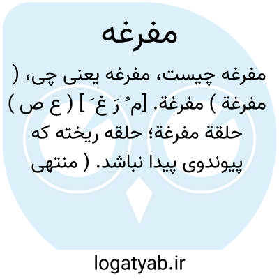 ( مفرغة ) مفرغة. [م ُ رَ غ َ ] ( ع ص ) حلقة مفرغة؛ حلقه ریخته که پیوندوی پیدا نباشد. ( منتهی الارب ) ( از آنندراج ) ( ناظم الاطباء ). مصمتة الجوانب غیر مقطوعة. ( اقرب الموارد ).
