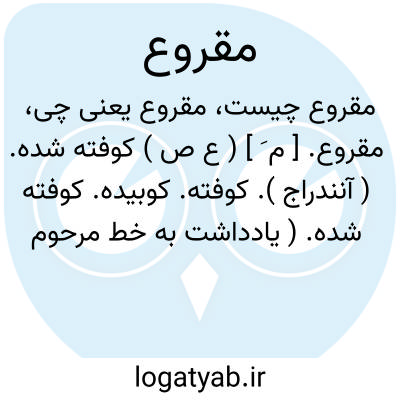 مقروع. [ م َ ] ( ع ص ) کوفته شده. ( آنندراج ). کوفته. کوبیده. کوفته شده. ( یادداشت به خط مرحوم دهخدا ). || شتر داغ قَرعه یا قُرعه کرده شده. ( منتهی الارب ) ( از اقرب الموارد ). شتری که بر ساق وی داغ نهاده باشند یا شتر داغ کرده به داغ بینی. ( ناظم الاطباء ). || شتر گزیده به جهت گشنی. ( منتهی الارب ) ( آنندراج ) ( از ناظم الاطباء ). || مهتر قوم. ( منتهی الارب ) ( آنندراج ). مهترقوم و سید قوم. ( ناظم الاطباء ) ( از اقرب الموارد ).