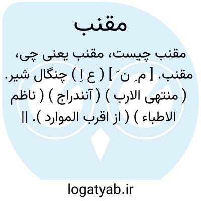 مقنب. [ م ِ ن َ ] ( ع اِ ) چنگال شیر. ( منتهی الارب ) ( آنندراج ) ( ناظم الاطباء ) ( از اقرب الموارد ). || توشه دان صیاد و توبره صیاد که صید درآن اندازد. || گله اسب از سی تا چهل عددیا مقدار سیصد. ( منتهی الارب ) ( آنندراج ) ( ناظم الاطباء ) ( از اقرب الموارد ). || جماعتی سوار که گرد آیند برای غارت. ج، مقانب. ( از اقرب الموارد ).