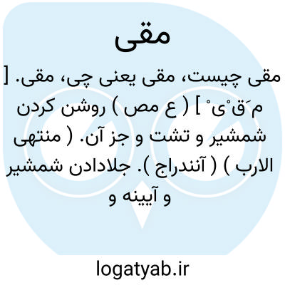 مقی. [ م َق ْی ْ ] ( ع مص ) روشن کردن شمشیر و تشت و جز آن. ( منتهی الارب ) ( آنندراج ). جلادادن شمشیر و آیینه و تشت یا دندان را. ( از ناظم الاطباء ) ( از اقرب الموارد ). || نگاه داشتن وگویند امقه مقیتک مالک ای صنه. ( منتهی الارب ) ( از ناظم الاطباء ) ( از اقرب الموارد ). و رجوع به مقو شود.