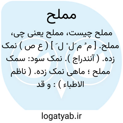 مملح. [ م ُ م َل ْ ل َ ] ( ع ص ) نمک زده. ( آنندراج ). نمک سود: سمک مملح؛ ماهی نمک زده. ( ناظم الاطباء ): و قد یتخذ من هذا النبات [ من شرش ] قبل ان یخرج شوکه مملح یکون طیباً. ( ابن البیطار، در کلمه شرش ).