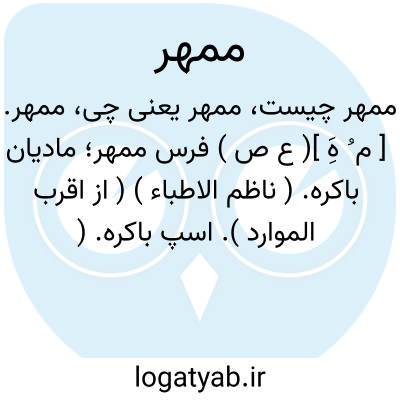 ممهر. [ م ُ هَِ ]( ع ص ) فرس ممهر؛ مادیان باکره. ( ناظم الاطباء ) ( از اقرب الموارد ). اسپ باکره. ( منتهی الارب ) ( آنندراج ).