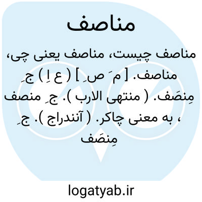 مناصف. [ م َ ص ِ ] ( ع اِ ) ج ِ مِنصَف. ( منتهی الارب ). ج ِ منصف، به معنی چاکر. ( آنندراج ). ج ِ مِنصَف یا مَنصف َ. ( اقرب الموارد ) ( ناظم الاطباء ). رجوع به منصف شود. || ج ِ مَنصَفة یا مِنصَفة. ( ناظم الاطباء ). رجوع به منصفة شود. || ج ِ مَنصَف. ( ناظم الاطباء ). رجوع به منصف شود.