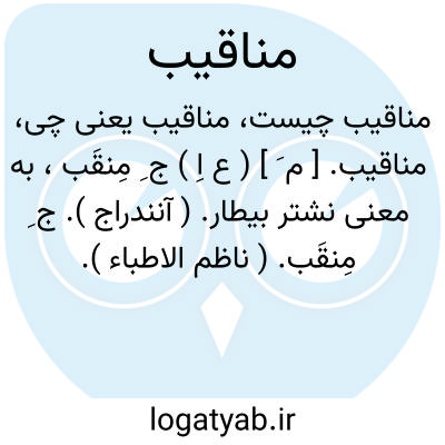 لغت نامه دهخدا مناقیب. [ م َ ] ( ع اِ ) ج ِ مِنقَب، به معنی نشتر بیطار. ( آنندراج ). ج ِ مِنقَب. ( ناظم الاطباء ).