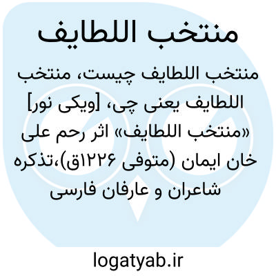 [ویکی نور] «منتخب اللطایف» اثر رحم علی خان ایمان (متوفی 1226ق)،تذکره شاعران و عارفان فارسی زبان از عصر سامانیان تا زمان مؤلف (صفویه)می باشد که توسط حسین و مهدی علیزاده، تصحیح و تنظیم شده است.