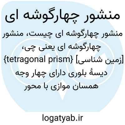 {tetragonal prism} [زمین شناسی] دیسۀ بلوری دارای چهار وجه همسان موازی با محور تقارن که در حالت آرمانی دارای برش عرضی مربع هستند متـ. منشور چهارگوش