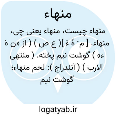 منهاء. [ م َ هََ ءْ ]( ع ص ) ( از «ن هَ ء» ) گوشت نیم پخته. ( منتهی الارب ) ( آنندراج ): لحم منهاء؛ گوشت نیم پخته. ( ناظم الاطباء ).
