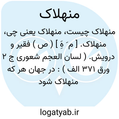 لغت نامه دهخدا منهلاک. [ م َ هَِ ] ( ص ) فقیر و درویش. ( لسان العجم شعوری ج 2 ورق 371 الف ): در جهان هر که منهلاک شوداز سؤال و حساب پاک شود.( از شعوری بدون ذکر نام شاعر ).