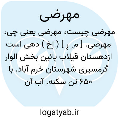 مهرضی. [ م ِ رِ ] ( اِخ ) دهی است ازدهستان قیلاب پائین بخش الوار گرمسیری شهرستان خرم آباد. با 650 تن سکنه. آب آن از رود بلارود و محصول آن غلات و لبنیات است. ( از فرهنگ جغرافیائی ایران ج 6 ).