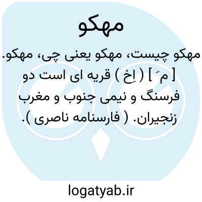 لغت نامه دهخدا مهکو. [ م َ ] ( اِخ ) قریه ای است دو فرسنگ و نیمی جنوب و مغرب زنجیران. ( فارسنامه ناصری ).
