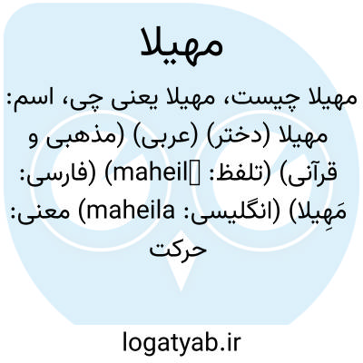 اسم: مهیلا (دختر) (عربی) (مذهبی و قرآنی) (تلفظ: maheilā) (فارسی: مَهِیلا) (انگلیسی: maheila) معنی: حرکت آهسته، روان، از واژه های قرآنی ( در سوره ی مزمّل )
