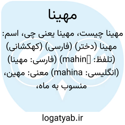 فرهنگ اسم ها اسم: مهینا (دختر) (فارسی) (کهکشانی) (تلفظ: mahinā) (فارسی: مهینا) (انگلیسی: mahina) معنی: مهین، منسوب به ماه، زیباروی، بزرگترین، ا ( پسوند نسبت ) )، منسوب به مهین