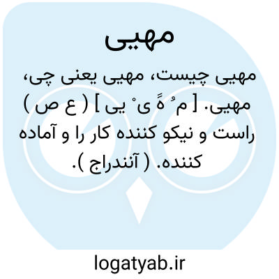 مهیی. [ م ُ هََ ی ْ یی ] ( ع ص ) راست و نیکو کننده کار را و آماده کننده. ( آنندراج ).