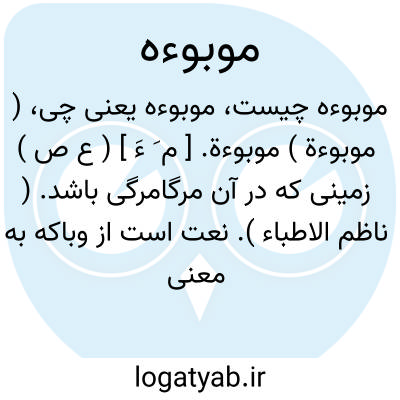 ( موبوءة ) موبوءة. [ م َ ءَ ] ( ع ص ) زمینی که در آن مرگامرگی باشد. ( ناظم الاطباء ). نعت است از وباکه به معنی بیماری ناک گردیدن زمین است. ( منتهی الارب ). زمین بیماری ناک. ( آنندراج ). و رجوع به وبا شود.