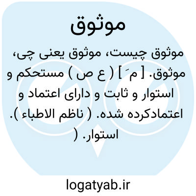 موثوق. [ م َ ] ( ع ص ) مستحکم و استوار و ثابت و دارای اعتماد و اعتمادکرده شده. ( ناظم الاطباء ). استوار. ( آنندراج ).