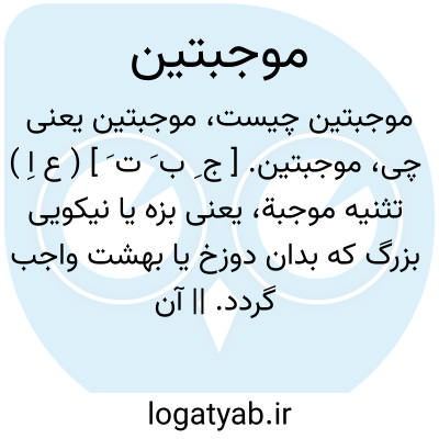 موجبتین. [ ج ِ ب َ ت َ ] ( ع اِ ) تثنیه موجبة، یعنی بزه یا نیکویی بزرگ که بدان دوزخ یا بهشت واجب گردد. || آن دعایی پس از هر نماز که در آن از خداوند عالم مسألت بهشت کنند و پناه برند از آتش دوزخ. ( ناظم الاطباء ). رجوع به موجبة شود.