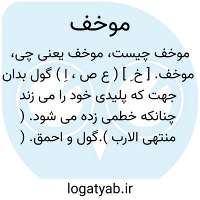 موخف. [ خ ِ ] ( ع ص، اِ ) گول بدان جهت که پلیدی خود را می زند چنانکه خطمی زده می شود. ( منتهی الارب ).گول و احمق. ( ناظم الاطباء ). || یک نوع طعامی که کشک را ساییده و در آب شورانیده و روغن بر آن ریخته خورند. کال جوش. ( ناظم الاطباء ). طعامی است که پینو را ساییده در آب شورانیده روغن یا چربش تنک بر آن ریزند. || خرما که در مسکه انداخته خورند. ( منتهی الارب ) ( آنندراج ). خرمای در مسکه انداخته.( ناظم الاطباء ). || آب گل آلوده. || بافنده چادر خز و یا صوف. || گلیم چهارگوشه ستبر. ( منتهی الارب ) ( ناظم الاطباء ) ( آنندراج ). || پزنده نان. نانوا. ( ناظم الاطباء ).