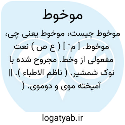 موخوط. [ م َ ] ( ع ص ) نعت مفعولی از وخط. مجروح شده با نوک شمشیر. ( ناظم الاطباء ). || آمیخته موی و دوموی. ( منتهی الارب ) ( آنندراج ). مرد آمیخته موی و دوموی. ( ناظم الاطباء ). آن که سفیدی در موی وی پدید آمده بود. ( مهذب الاسماء ).