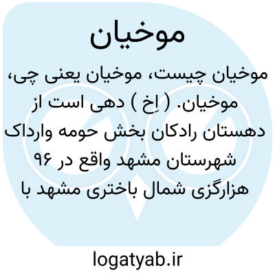 موخیان. ( اِخ ) دهی است از دهستان رادکان بخش حومه وارداک شهرستان مشهد واقع در 96 هزارگزی شمال باختری مشهد با 846 تن جمعیت آب آن از رودخانه و راه آن مالرو است. ( از فرهنگ جغرافیائی ایران ج 9 ).
